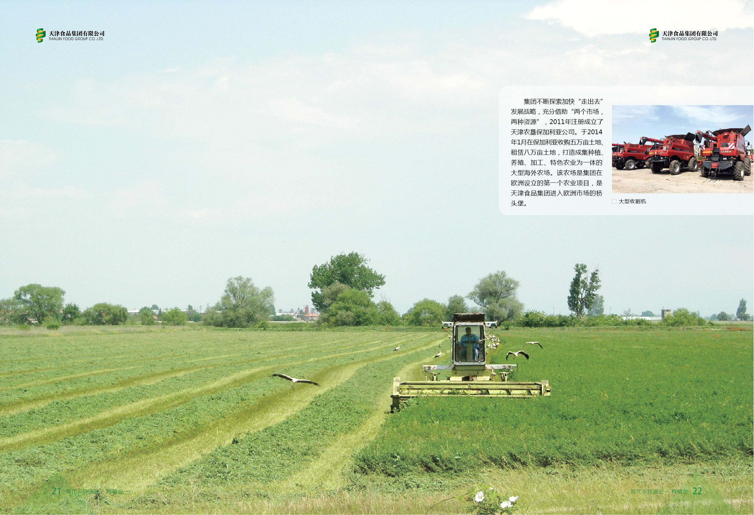 集團不斷探索加快“走出去”發(fā)展戰(zhàn)略,充分借助“兩個市場,兩種資源”,于2011年成立天津農(nóng)墾龍呈嘉益國際貿(mào)易有限公司,在保加利亞收購、租賃土地,打造成集種植、養(yǎng)殖、加工、特色農(nóng)業(yè)為一體的大型海外農(nóng)場。該農(nóng)場是集團在歐洲設(shè)立的第一個農(nóng)業(yè)項目,是天津食品集團進(jìn)入歐洲市場的橋頭堡。The Group quickens its pace to implement the “going global” development strategy, and fully leverages the “two markets, two resources” advantage. In 2011, Tianjin Agriculture Reclamation Longcheng Jiayi International Trade Co., Ltd. was established. The company acquires and leases land in Bulgaria, and builds a large overseas farm that combines planting, breeding, processing and characteristic agriculture. The farm is the first agricultural project the Group launched in Europe, and is also the “bridgehead” for Tianjin Food Group to enter the European market.